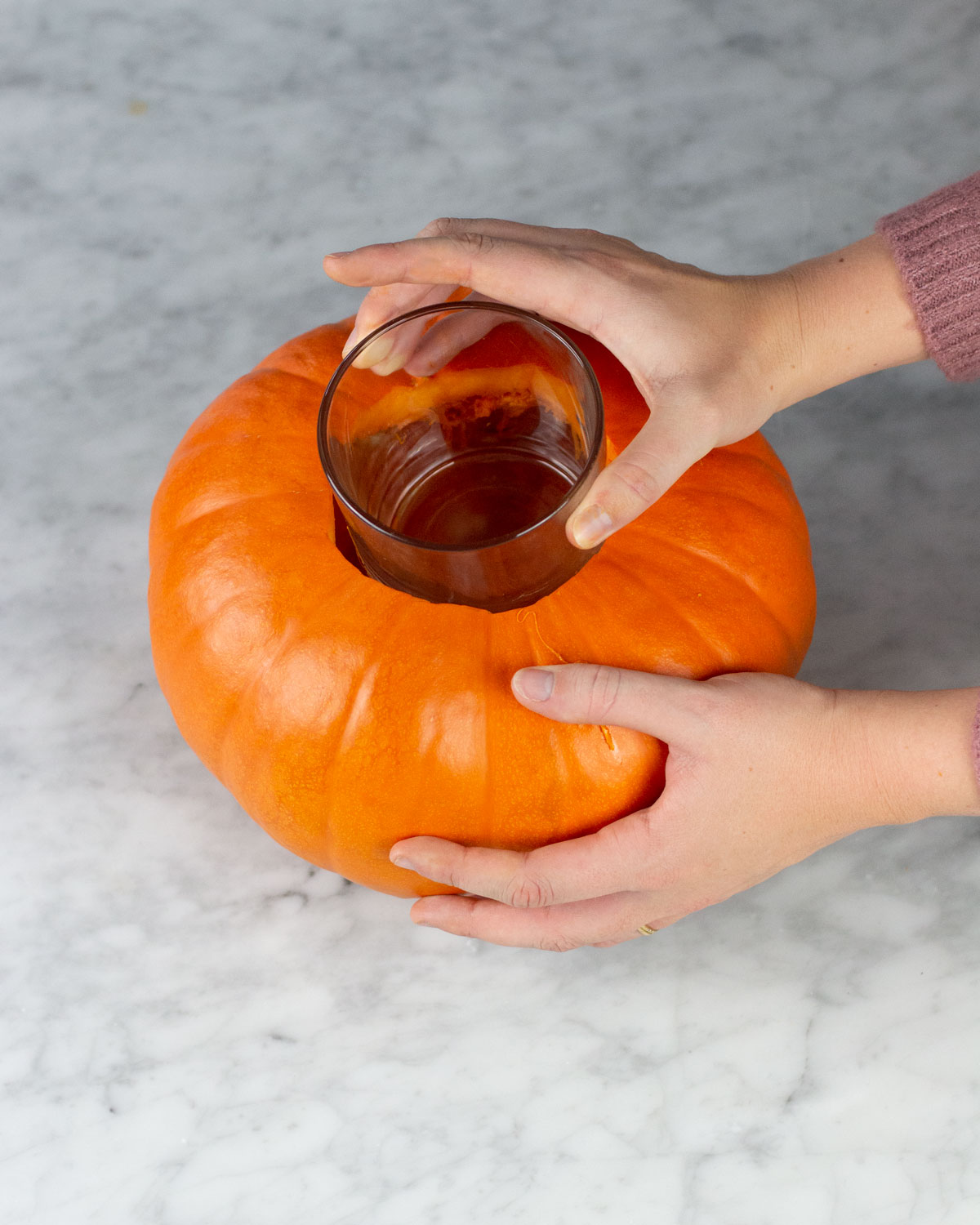 1. Placera glasvasen upp och ner i mitten av pumpan. Markera med en penna runt vasen för att mäta ut hur stort hål du behöver göra.