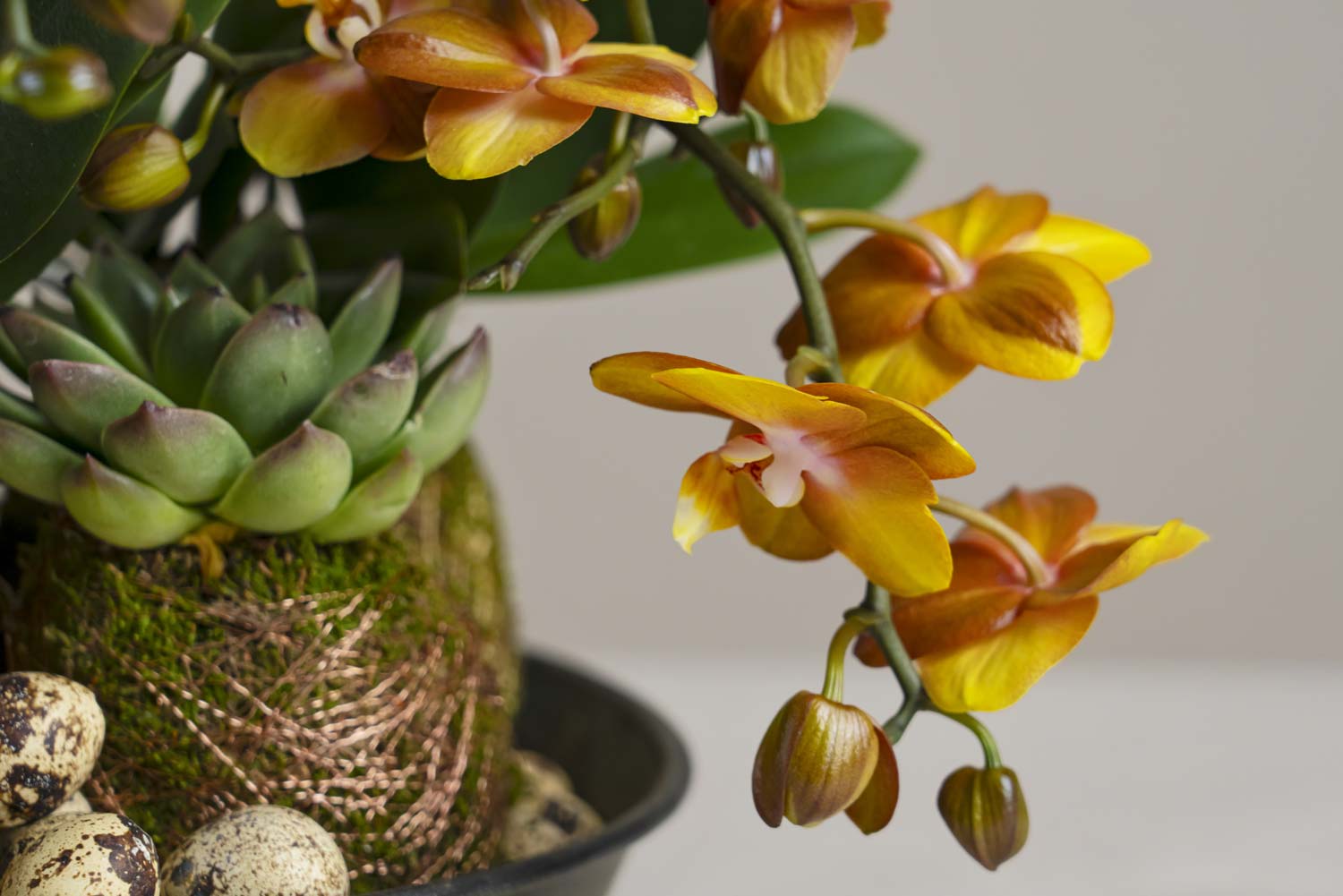 – Förutom att det är fint så suger mossa både åt sig och avger fukt, vilket gör att blommorna inte blir övervattnade. Orkidén är också en sådan blomma som fått lite dåligt rykte, men som är fantastisk och blommar länge.