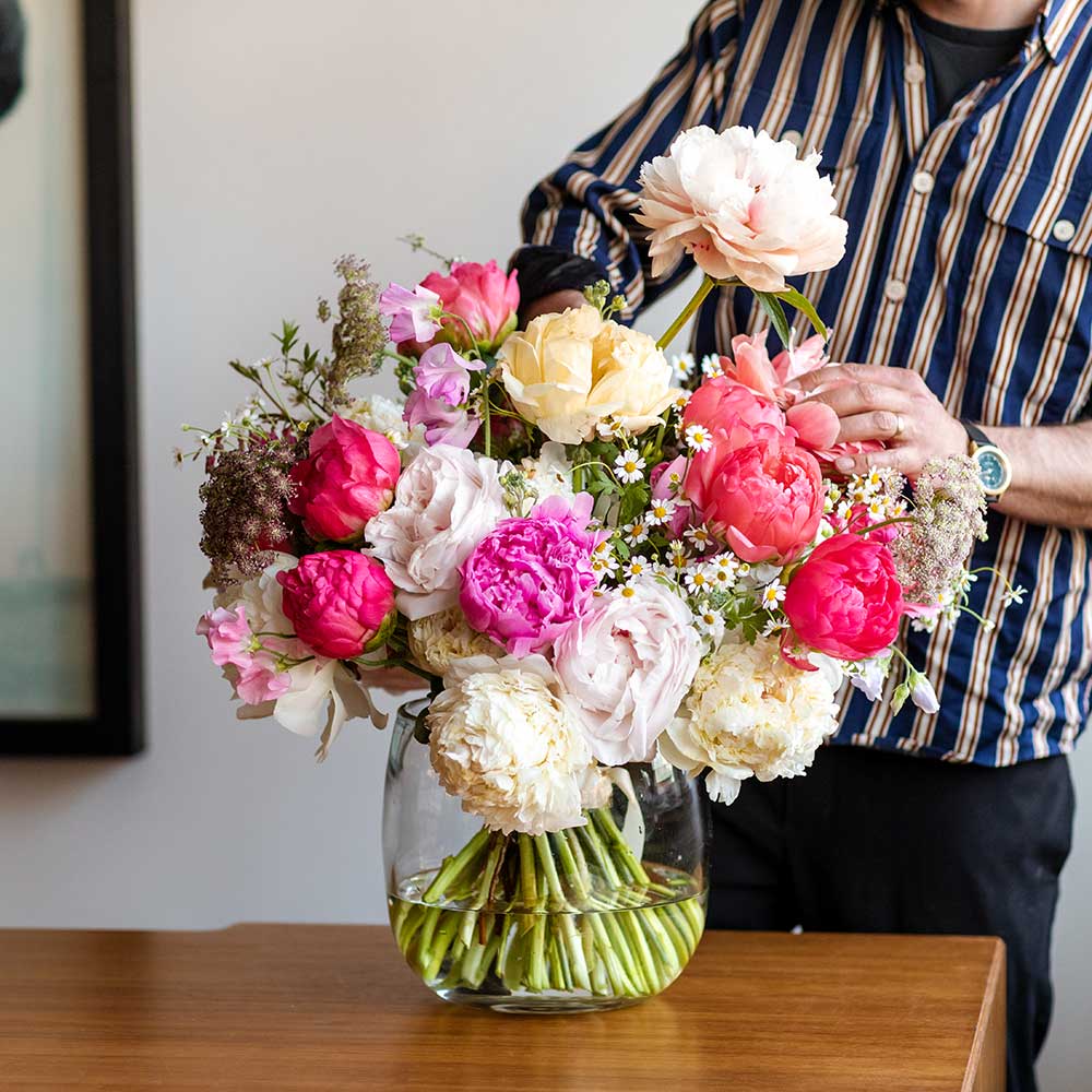 Du ska byta vattnet i vasen varannan dag. Vill du att dina pioner ska slå ut snabbare kan du fylla vasen med varmt vatten. Vill du hellre behålla dess runda knoppar lite längre ska du fylla vasen med kallt vatten.