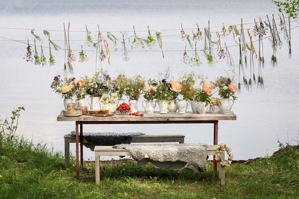 Återbruk passar perfekt till midsommarfesten. Plocka fram sådant som göms i skåpen – gamla kaffekannor på rad gör bordet festfint. Några småbuketter kan stå i gräddsnipor för variationens skull.