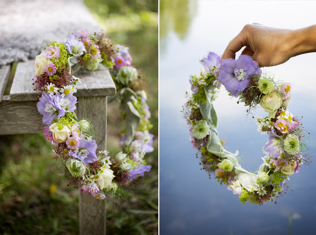 – Om du har lammöron i rabatten kan du plocka några blad och binda dem på insidan, som ett foder över stjälkarna. Då blir kransen skönare att bära på huvudet. Barnen älskar det och den blir vacker att hänga på väggen, tipsar Charlotte.