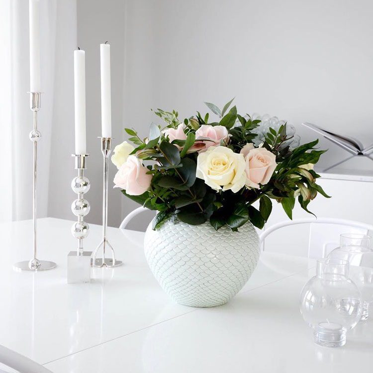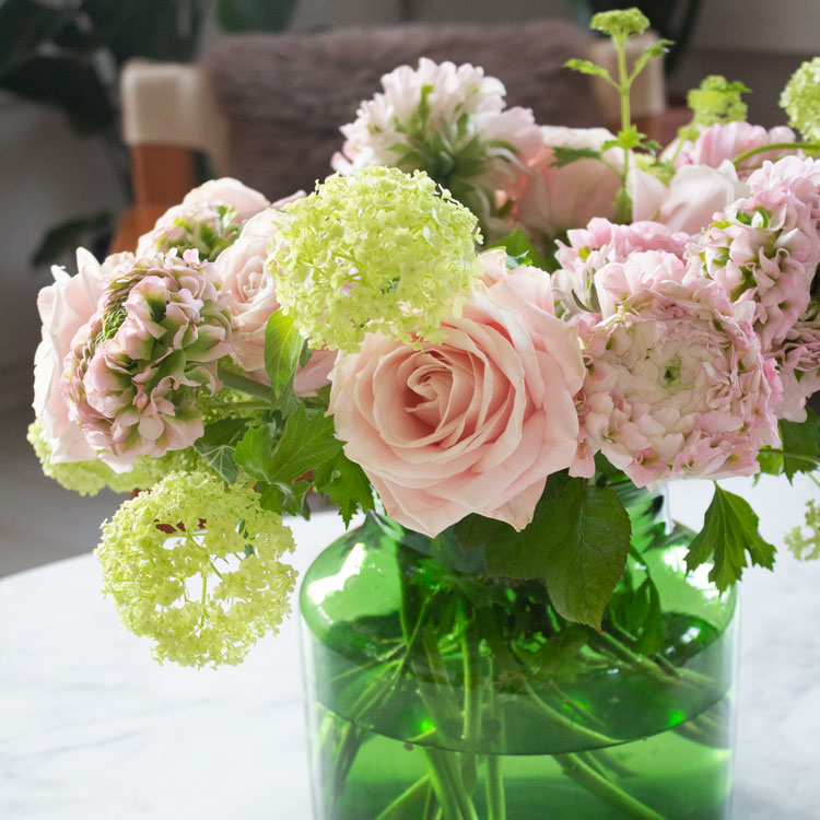 En fantastisk rosdröm med cremevita och ljusrosa rosor tillsammans med alstroemeria och blandat grönt hemma hos Mia Steij.