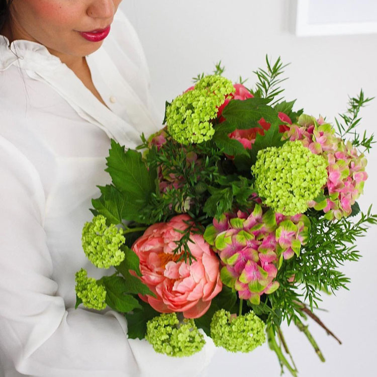 Cecilia Nilsson håller i en magisk Floristens val med sommarens sägongsblommor. Stora pioner kombinerade tillsammans med maffig snitthortensia, viburnum och grönt.