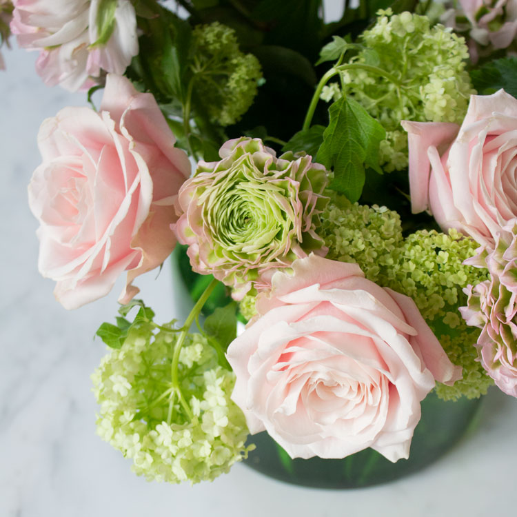 En rosa dröm med vackra ljusrosa rosor, viburnum och nejlikor.