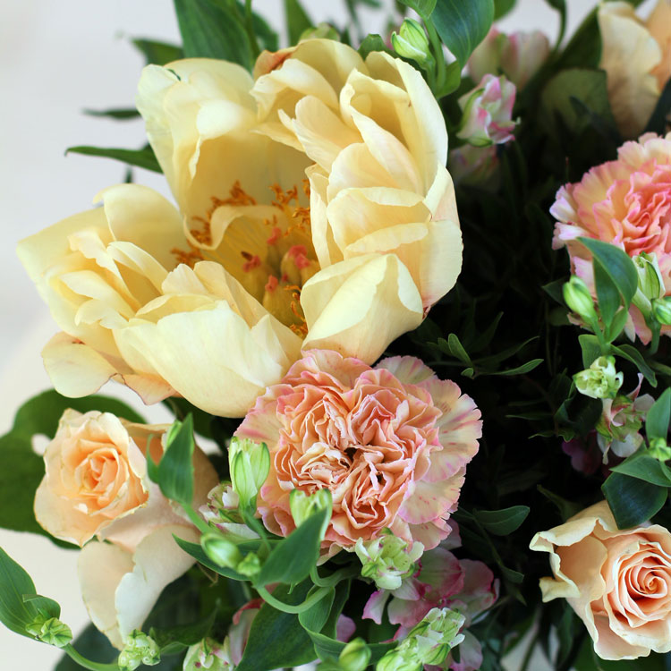 Denna bukett är som en vacker solnedgång. Floristen har skapat den med bland annat pionen Coral Charm som ändrar färg under blomningen, från mörk till ljus. Pionerna är komponerade tillsammans med rosor, nejlikor, alstroemeria och grönt.
