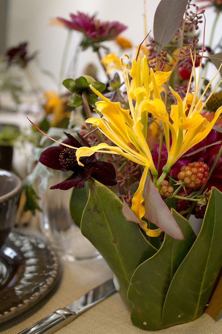 Ett tips är att göra många små buketter av sensommarens färgstarka favoriter som chokladblomma, dahlia och solhatt blandat med björnbär, nypon och jordärtskocka. Resultatet blir vilt och vackert! Är du sugen på att slå på stort? Plocka blommor och grönt från trädgård och natur och kombinera med spännande köpeblommor! Gul klänglilja (gloriosa) och orkidéer ger en exotisk touch till din dekoration.