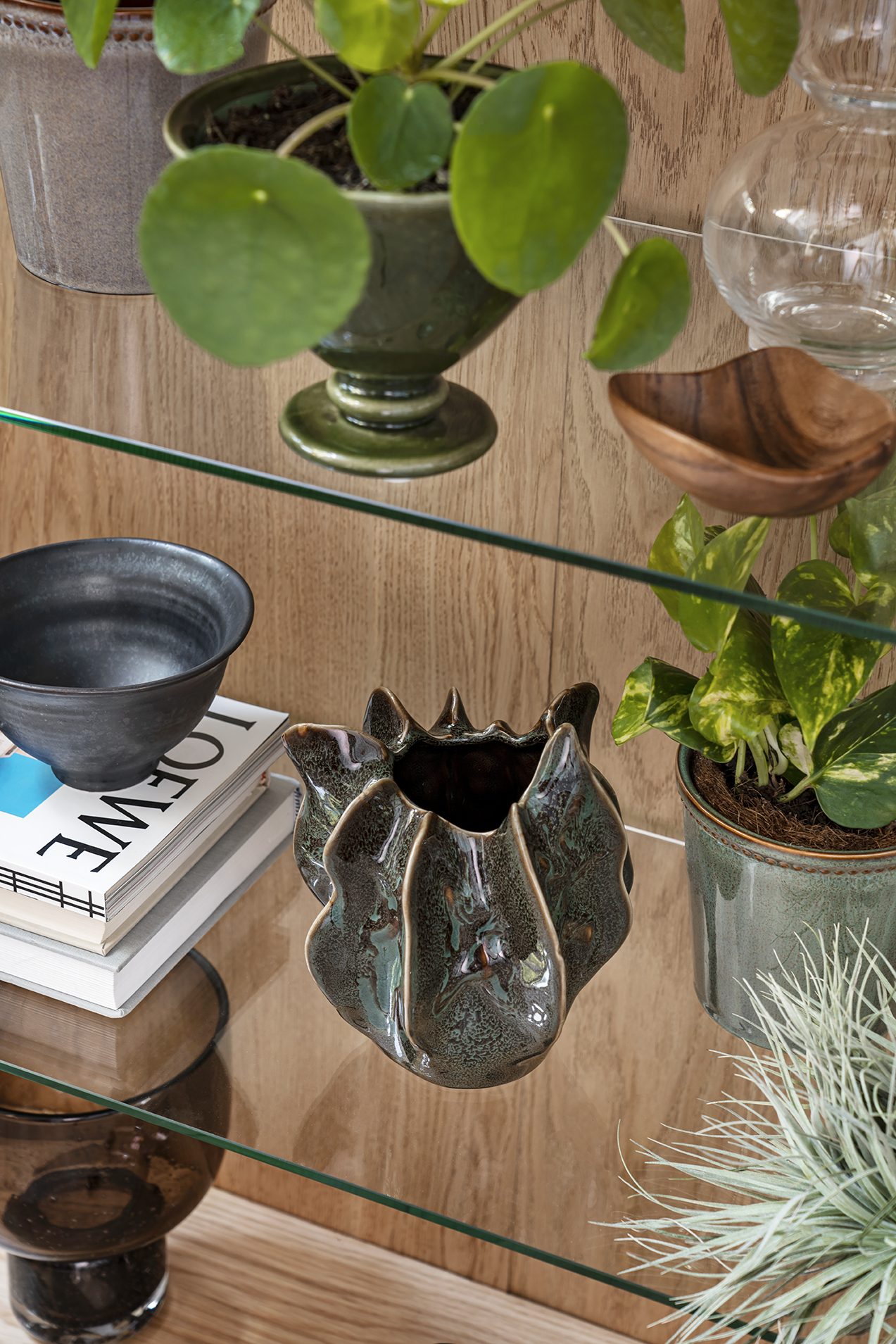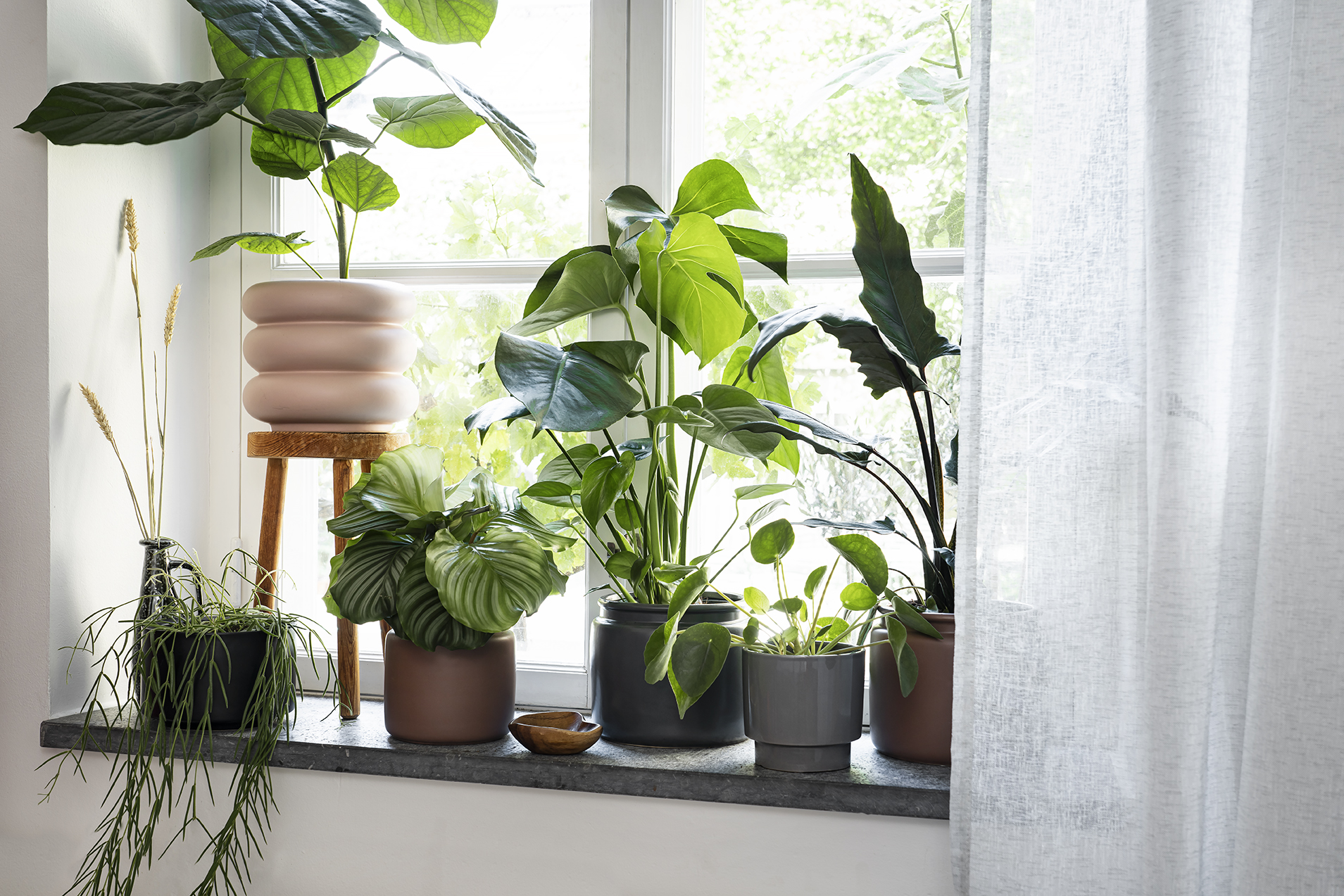 Fiolfikus är en annan favorit som med tiden kan bli upp emot två meter. Den är fin i en stor korg på golvet i närheten av fönstret, där den får ljus men inte riskerar att brännas av solen. Längre in, i en skål eller ett fat på soffbordet, trivs den spännande och originella luftplantan. Den vill varken stå i jord eller kruka, utan känna sig fri som den är van att göra högt upp i grenverket i Amazonas regnskogar. I stället för att vattna sprejar du den, samla regnvatten om du vill skämma bort den. Den gillar också att ta ett bad. Och få frisk luft. Man kan relatera, eller hur? Mycket charm väntar – luftplantan är enkel att tycka om och drar garanterat nyfikna blickar till sig när du har gäster på besök.