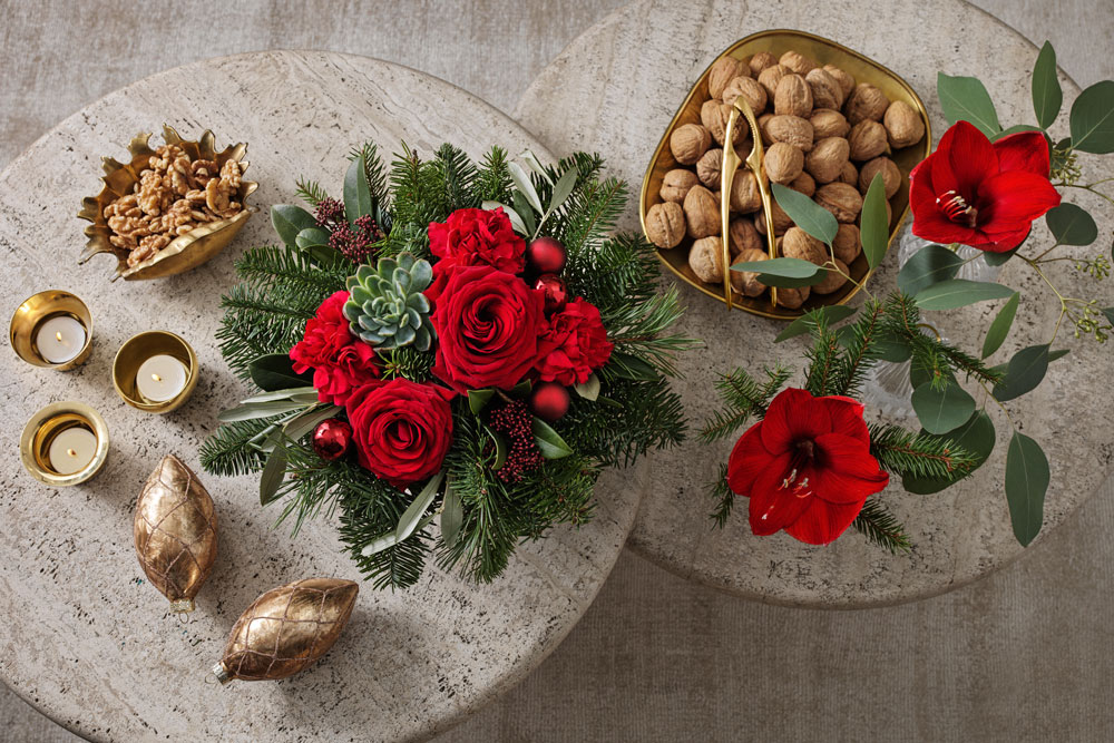 Julen är högtiden då vi dukar, dekorerar och pyntar med blommor för att skapa en stämningsfull känsla hemma. Elegant vitt, trendigt bordeaux eller klassiskt rött – vilken stil väljer du?