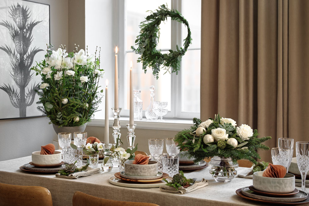 Här har vi dukat upp för en middag i vitt och naturfärger där blommorna får stå i centrum. Material som kristall, trä och sten ger dukningen en elegent och lyxig känsla. Den maffiga och vackra dekorationen Strålande vinter, med vide, amaryllis och gran, har vi placerat bredvid bordet för att rama in dukningen och mitt på bordet står den stilrena buketten Vinterdröm, med bland annat rosor, taklök och nejlikor.