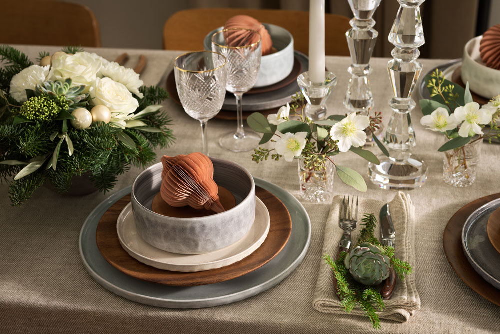 På bordet ligger en beige duk i linne och tallrikarna är en blandning av sten, keramik och trä. I de djupa skålarna ligger en vacker pappersdekoration i kopparfärg som hämtar upp trätallrikarnas färgton fint. I de mindre kristallvaserna står små buketter av julrosor och eukalyptus. På servetterna har vi dekorerat med taklökar och kvistar av gran.